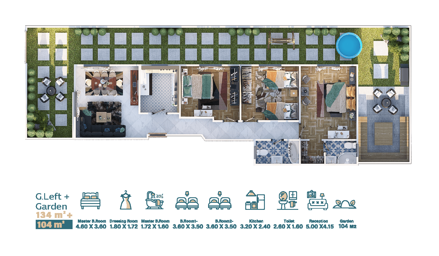 شقة أرضي يسار الواجهـة 134م+104م حديقة