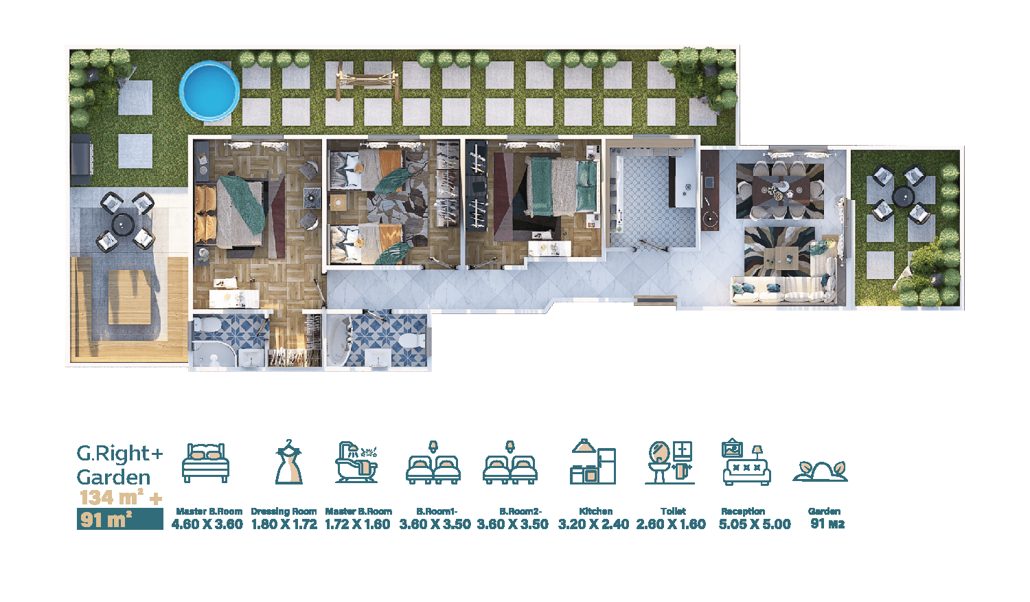 شقة أرضي يمين الواجهـة 134م+91م حديقة