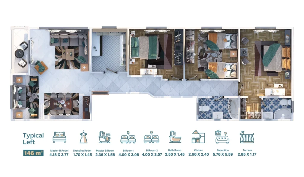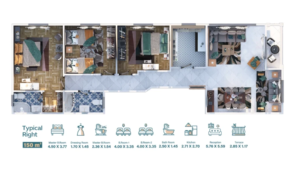 لديك كل وسائل الراحة والأمان بداية من المواد البناء المستخدمة والمطابقة للمواصفات العالمية، إلى التقسيم والتوزيع الداخلي للشقة وحتى الدهانات العازلة للحرارة والانتركم المرئي.