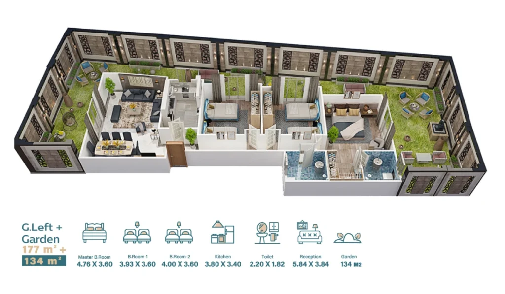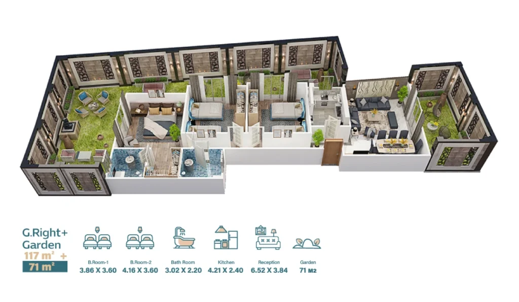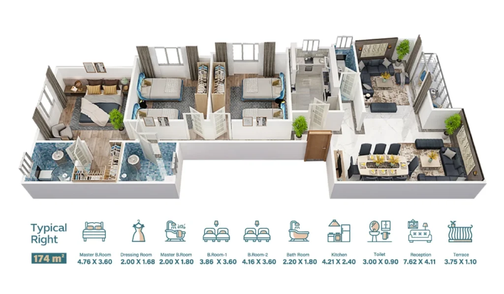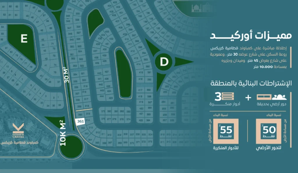 Your home in Orchid D361 is situated on a 30-meter wide street, perpendicular to a 45-meter wide street, and a square and island of 10,000 square meters, with a direct view of the Katameya Creeks compound.