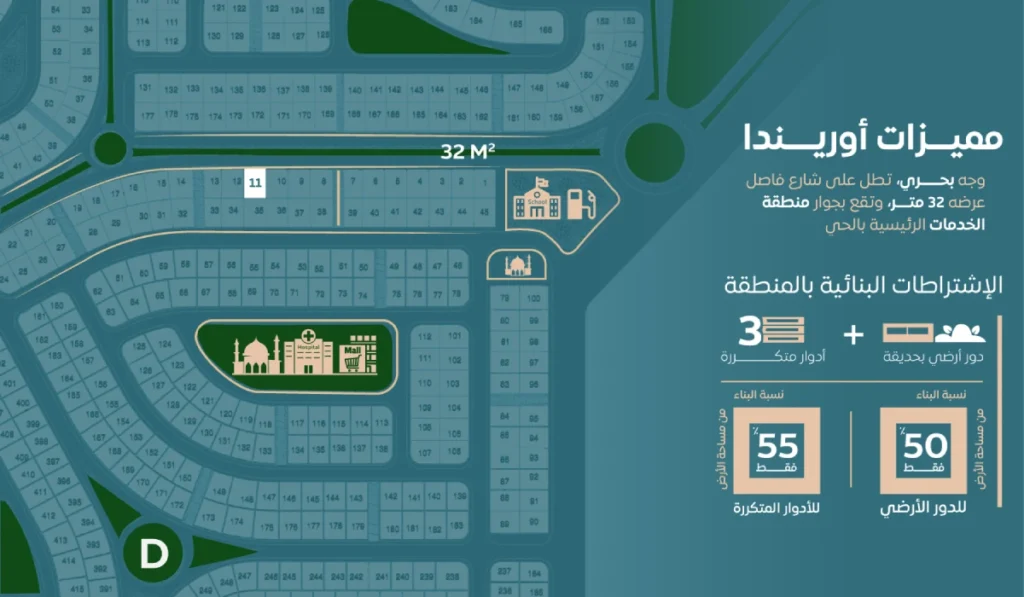 – In Orienda , you live with a sea view on a 32-meter-wide street next to the main service area of the neighborhood.