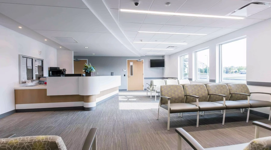 Dedicated spaces are provided for patients to wait comfortably before appointments, equipped with seating and amenities for their convenience.